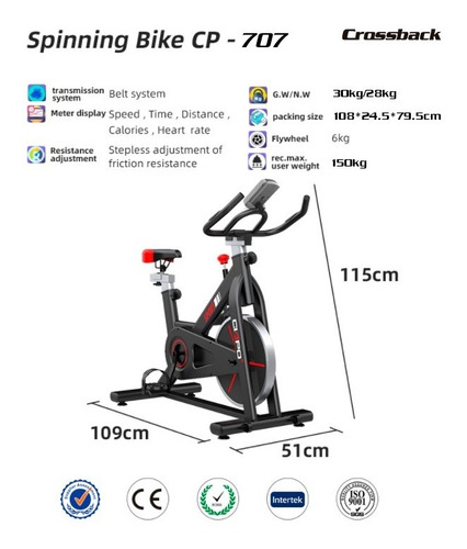 La bicicleta SPINNING 707, es una construcción muy bien pensada y diseñada para todos aquellos que buscan la satisfacción en un ejercicio cardiovascular intenso y en la comodidad del hogar, ya que brinda una excelente estabilidad, además de lo silenciosa en su ejecución al momento de pedalear. Cuenta con pedales de aluminio con seguro que se adaptan a cualquier pie o calzado, permitiendo realizar un seguro y constante movimiento cíclico en la ejecución.