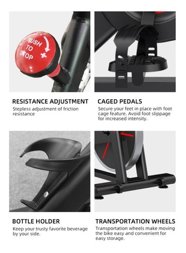 La bicicleta posee en su base delantera, ruedas que permiten un fácil desplazamiento. Cuenta con un soporte para bebidas o botellas, en esta versión se incluye una botella metálica de hidratación.