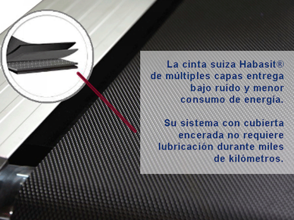 Con inclinacion variable en 26 grados (15%), brinda la opcion de simular carreras, caminatas, itinerarios y maratones, y regulados según la biometría del usuario.